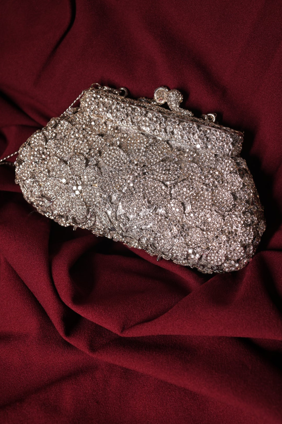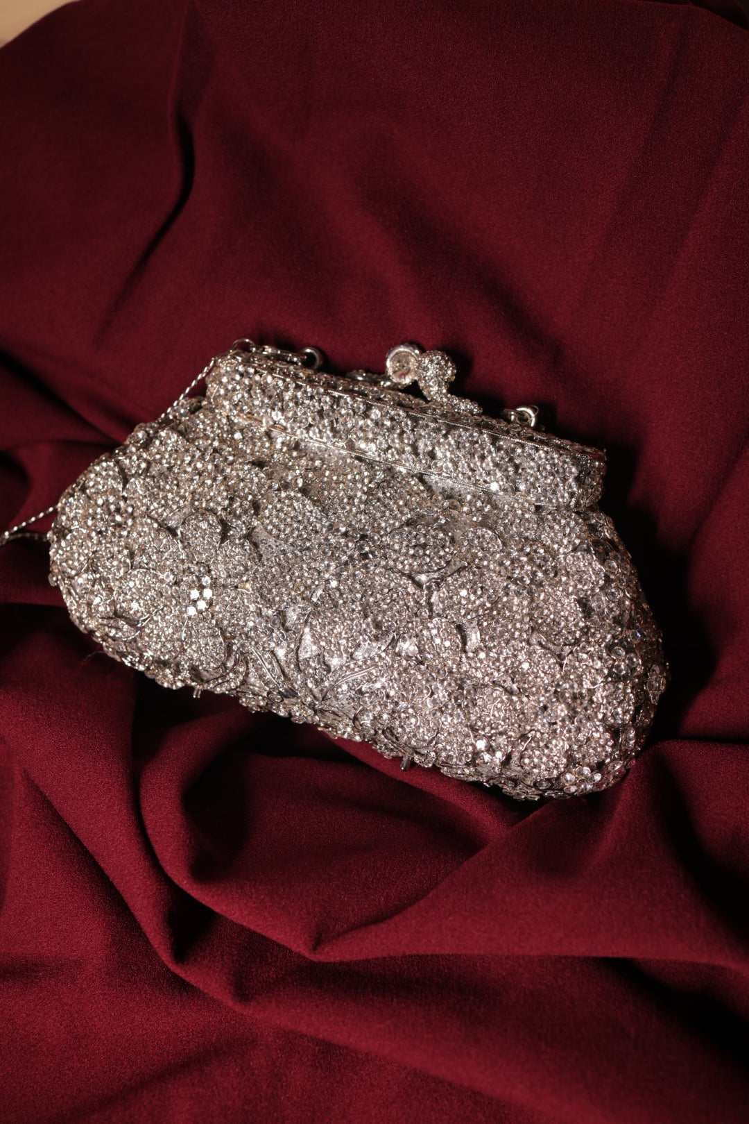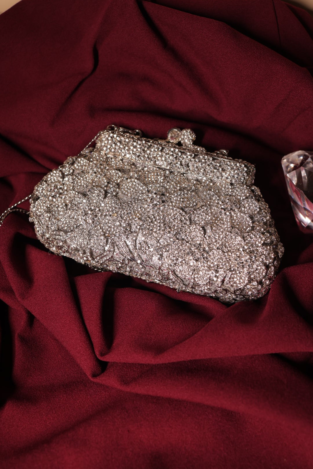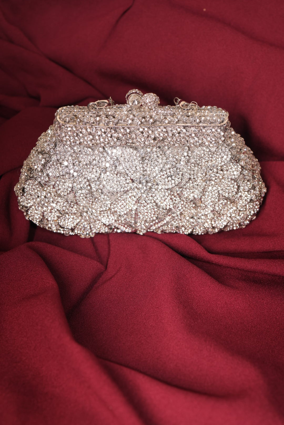 The clutch is an exquisite piece, adorned with intricate floral designs made of sparkling crystals and a delicate bow clasp for added charm. It comes in three luxurious colors: