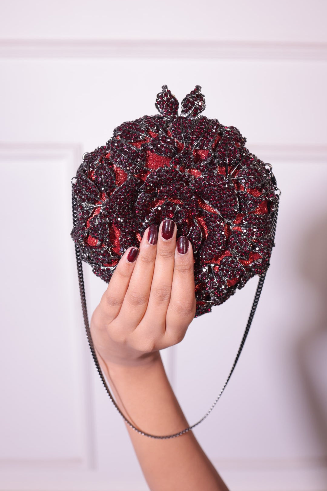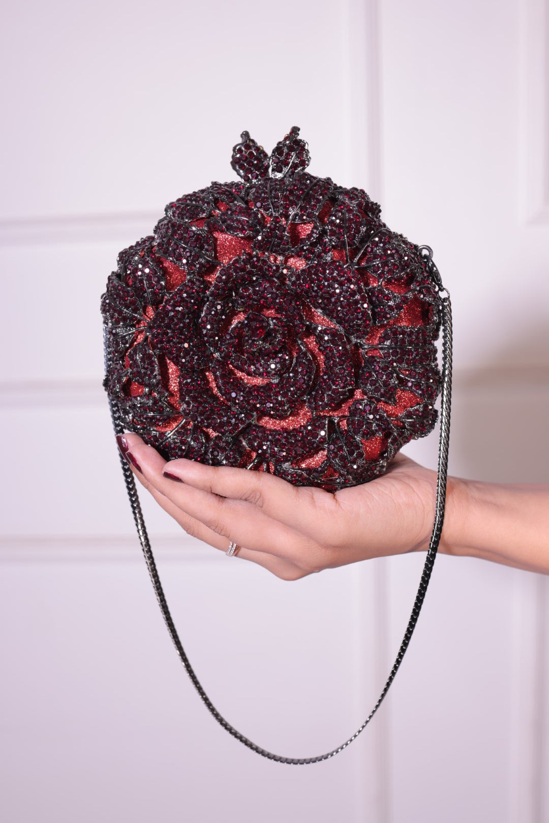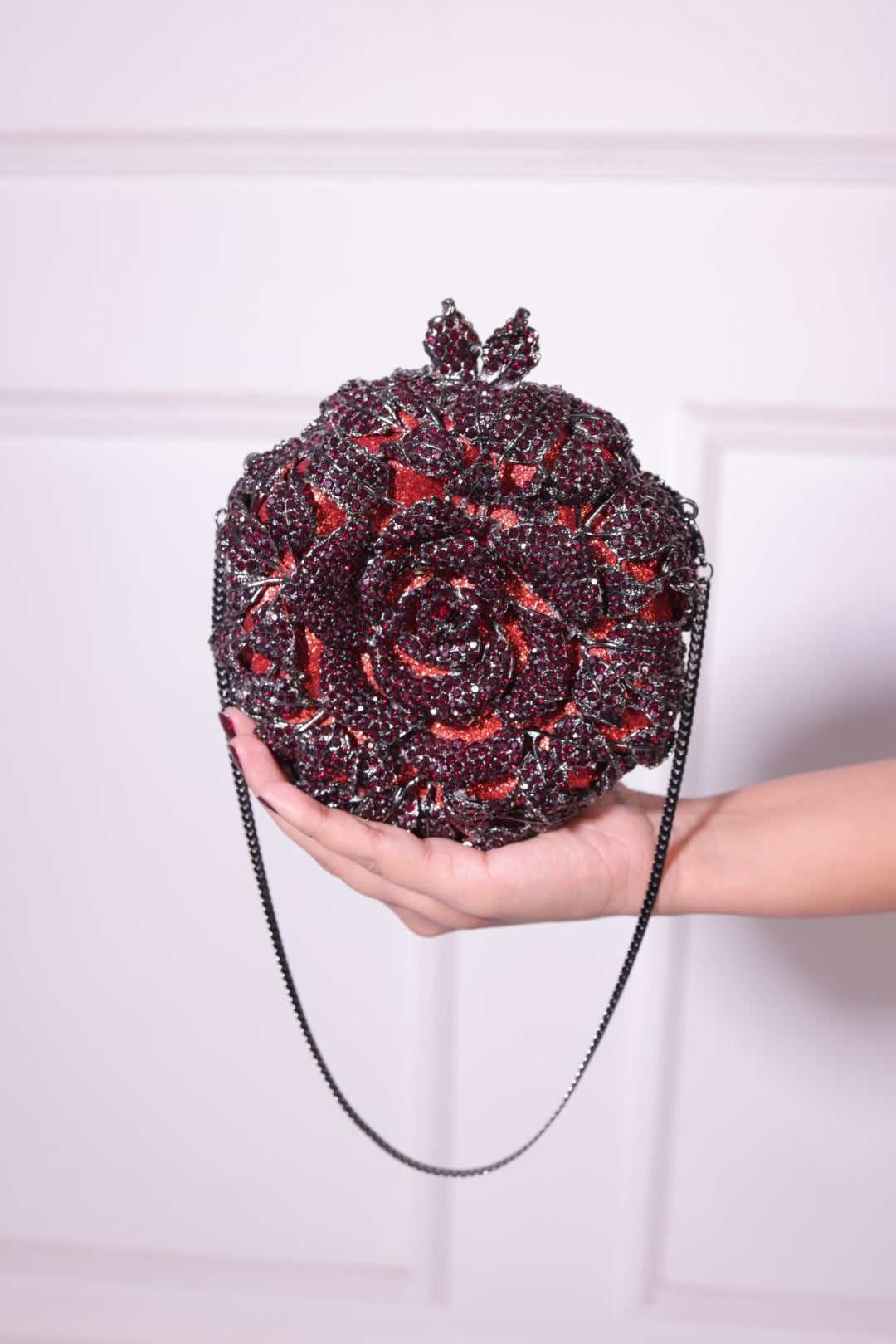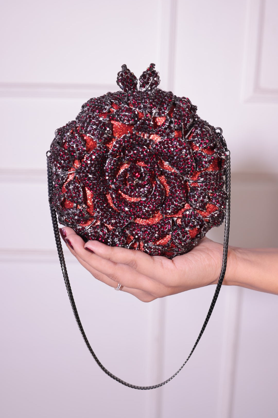 This clutch is intricately adorned with shimmering crystals, highlighting the delicate petals and leaves of the rose. Crafted with a sturdy Metal frame, a detachable chain, and a secure clasp, this clutch offers both style and practicality. Its shimmering crystals, delicate petals, and intricate leaves make it a statement piece perfect for special occasions, adding a touch of glamour to any ensemble