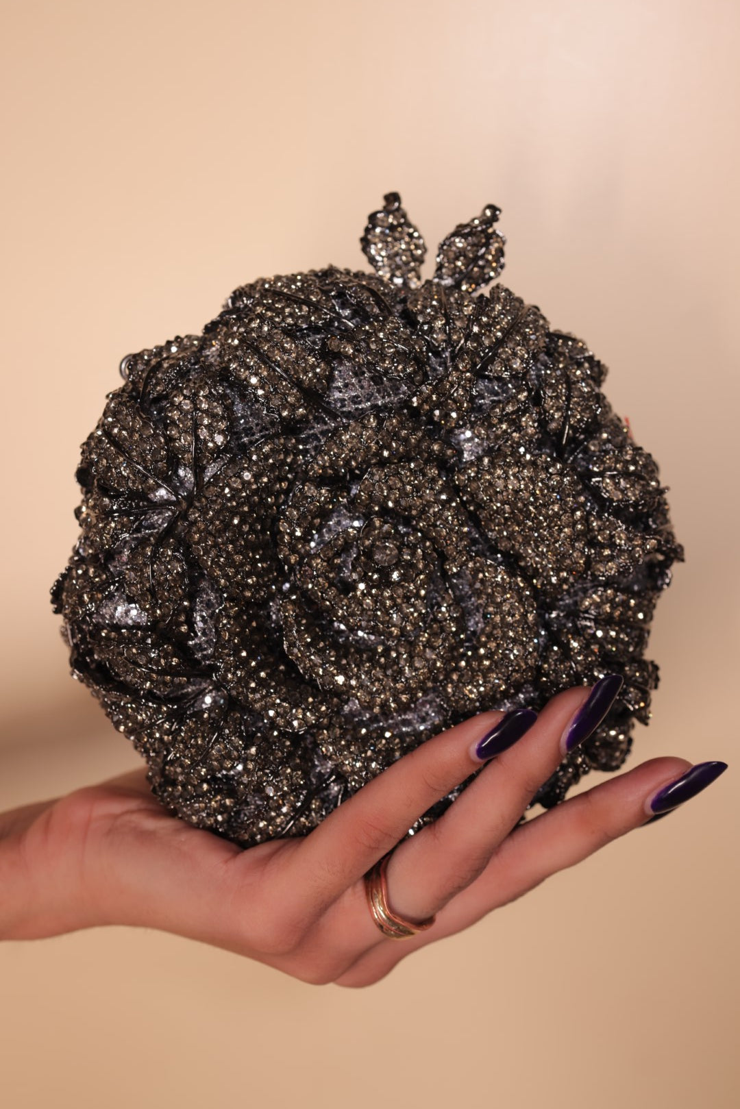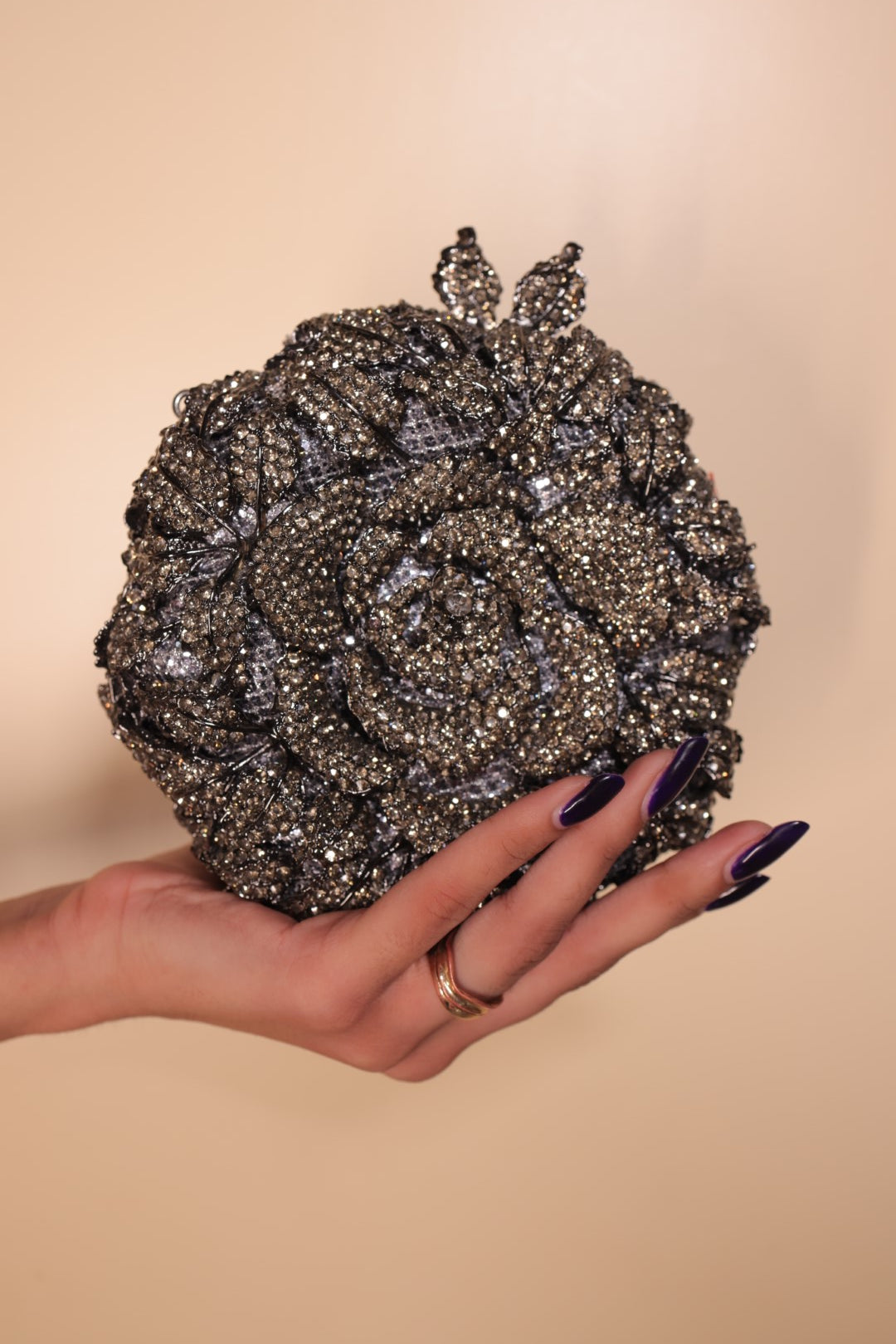 This clutch is intricately adorned with shimmering crystals, highlighting the delicate petals and leaves of the rose. Crafted with a sturdy Metal frame, a detachable chain, and a secure clasp, this clutch offers both style and practicality. Its shimmering crystals, delicate petals, and intricate leaves make it a statement piece perfect for special occasions, adding a touch of glamour to any ensemble