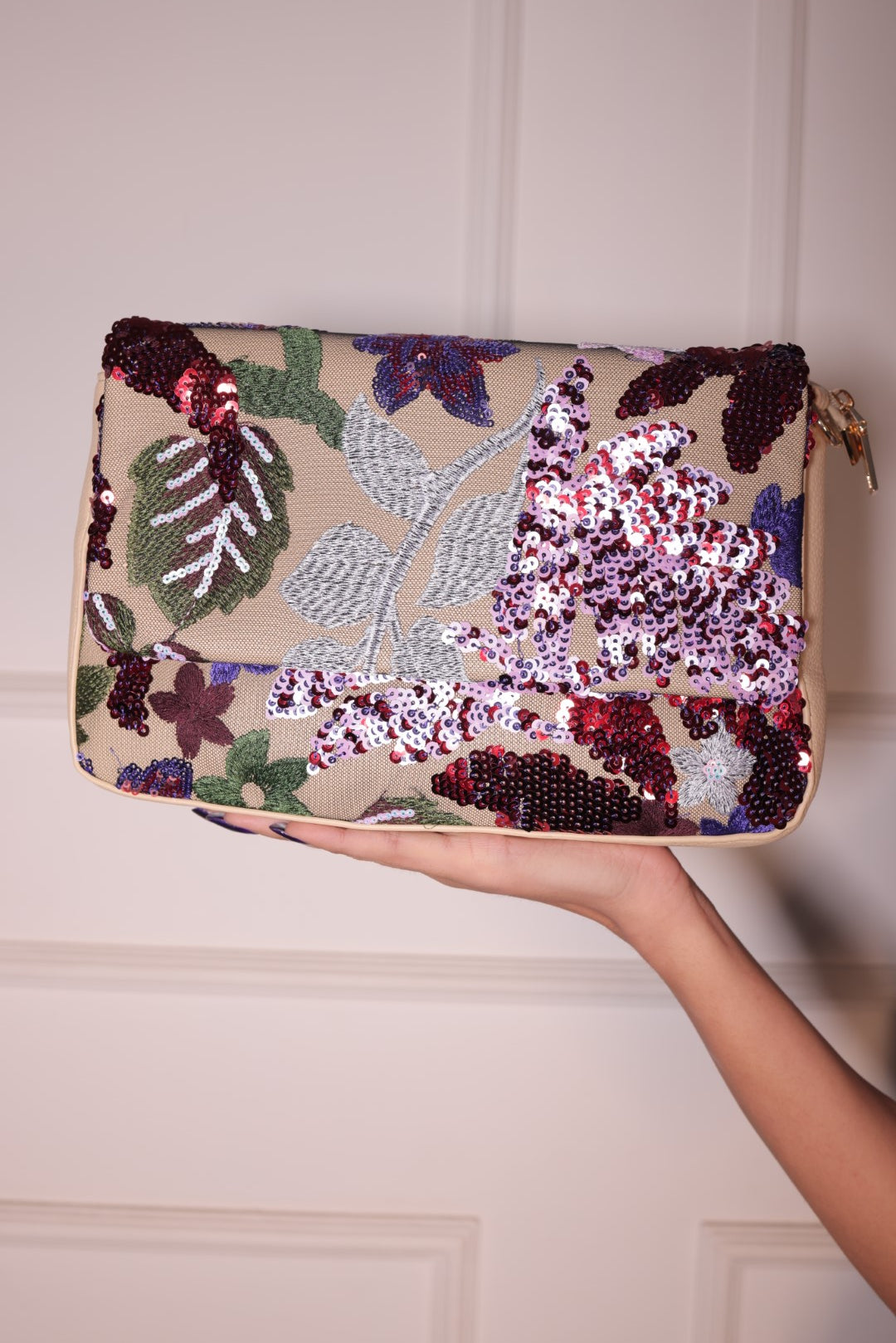 Bag is adorned with intricate floral patterns. Combination of casual yet elegant design makes it suitable for both formal and everyday occasions.