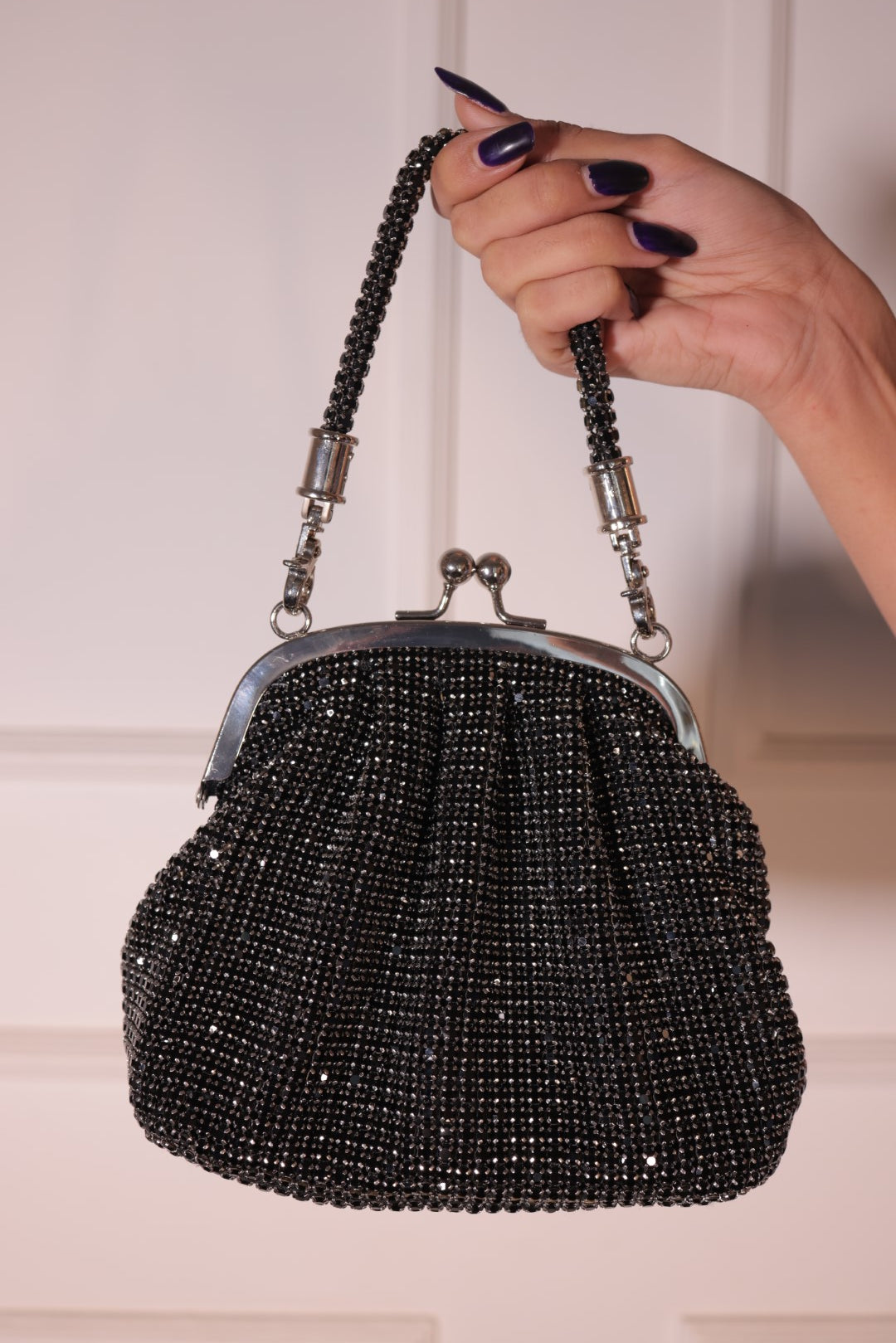 The bag feature a classic bucket ,adorned with shimmering rhinestones. Includes one crystal handle and one long sling..