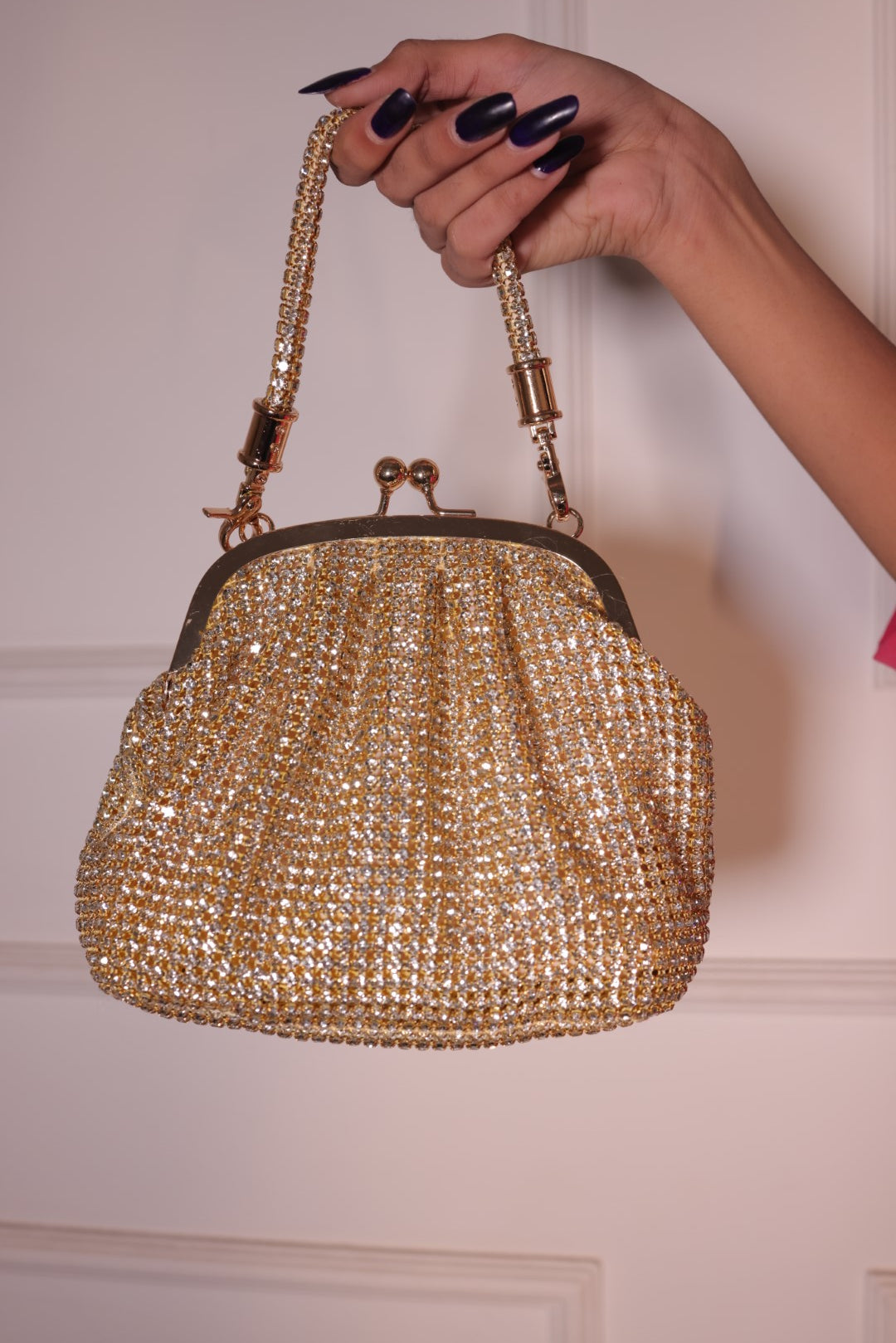 The bag feature a classic bucket ,adorned with shimmering rhinestones. Includes one crystal handle and one long sling.