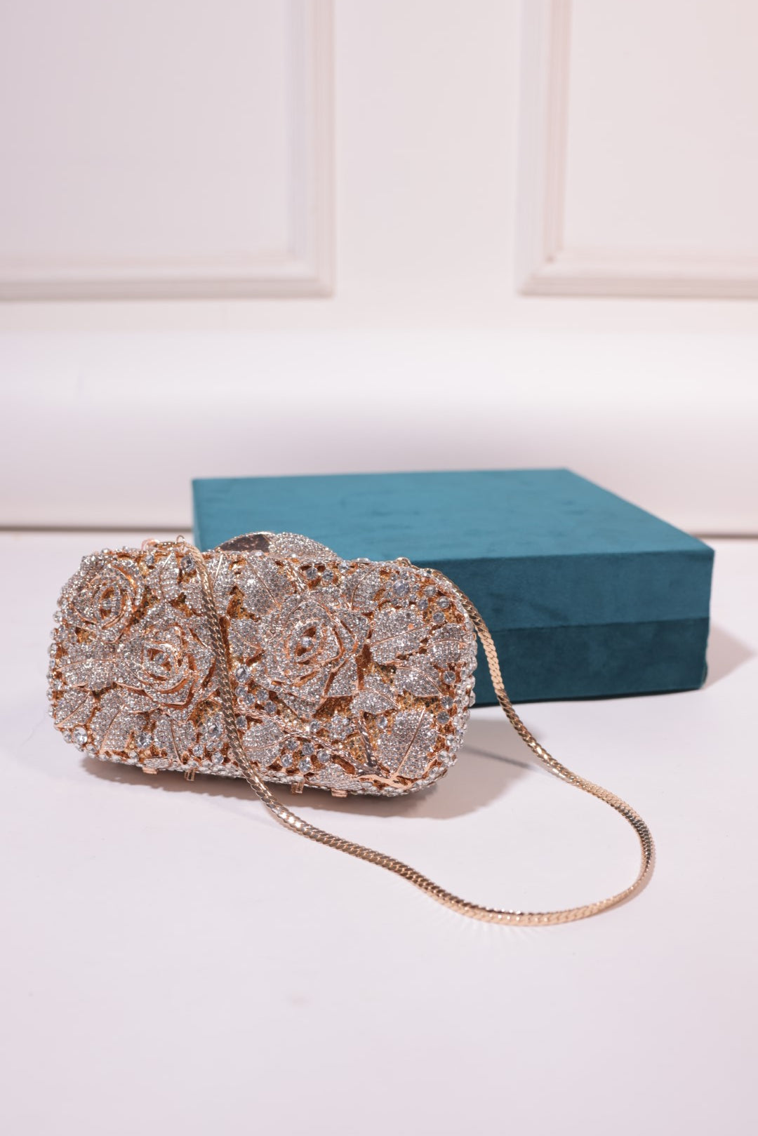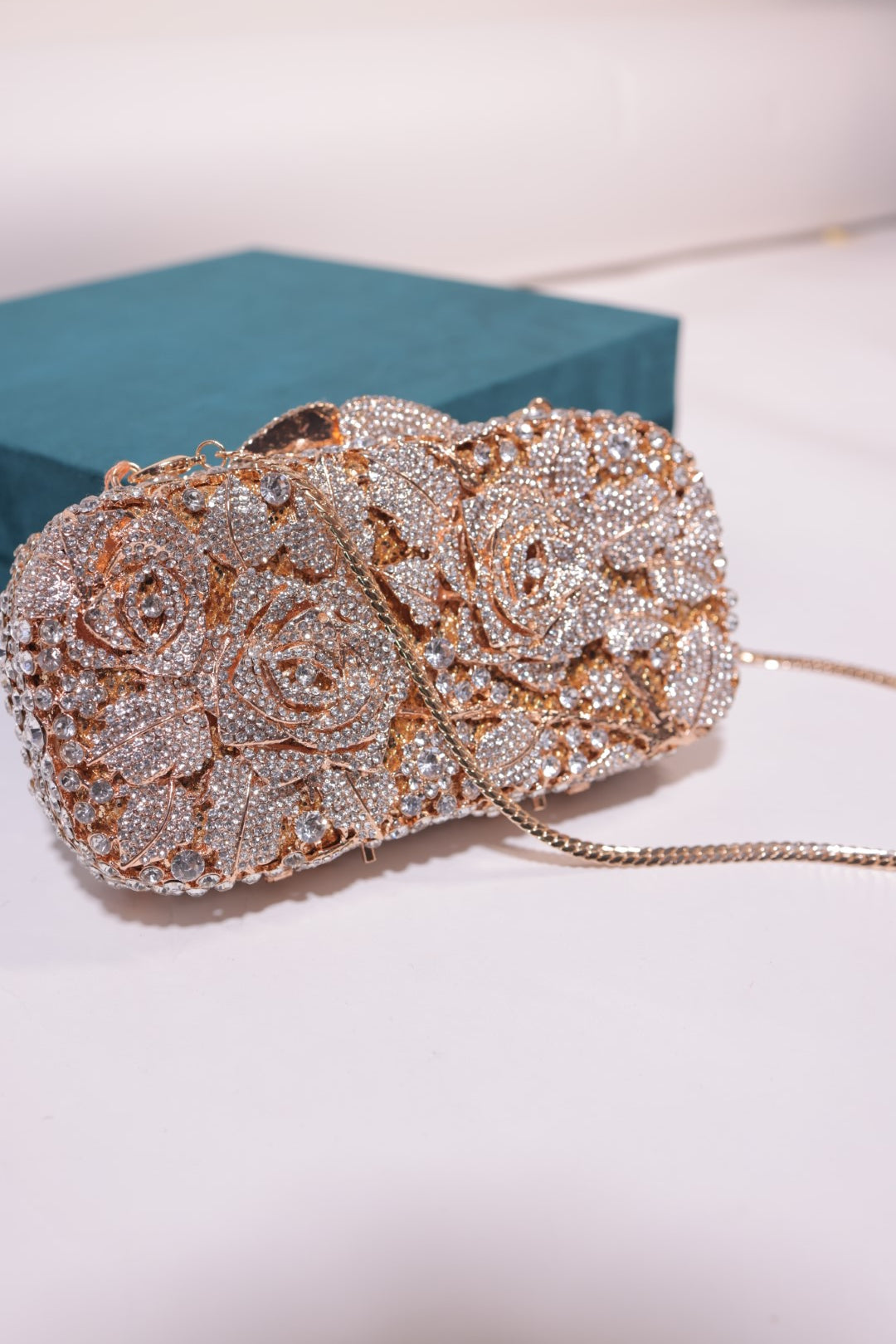 YUMEKA is a luxurious clutch featuring a beautifully intricate design of roses and leaves, all adorned with shimmering crystals that catch the light with every movement.