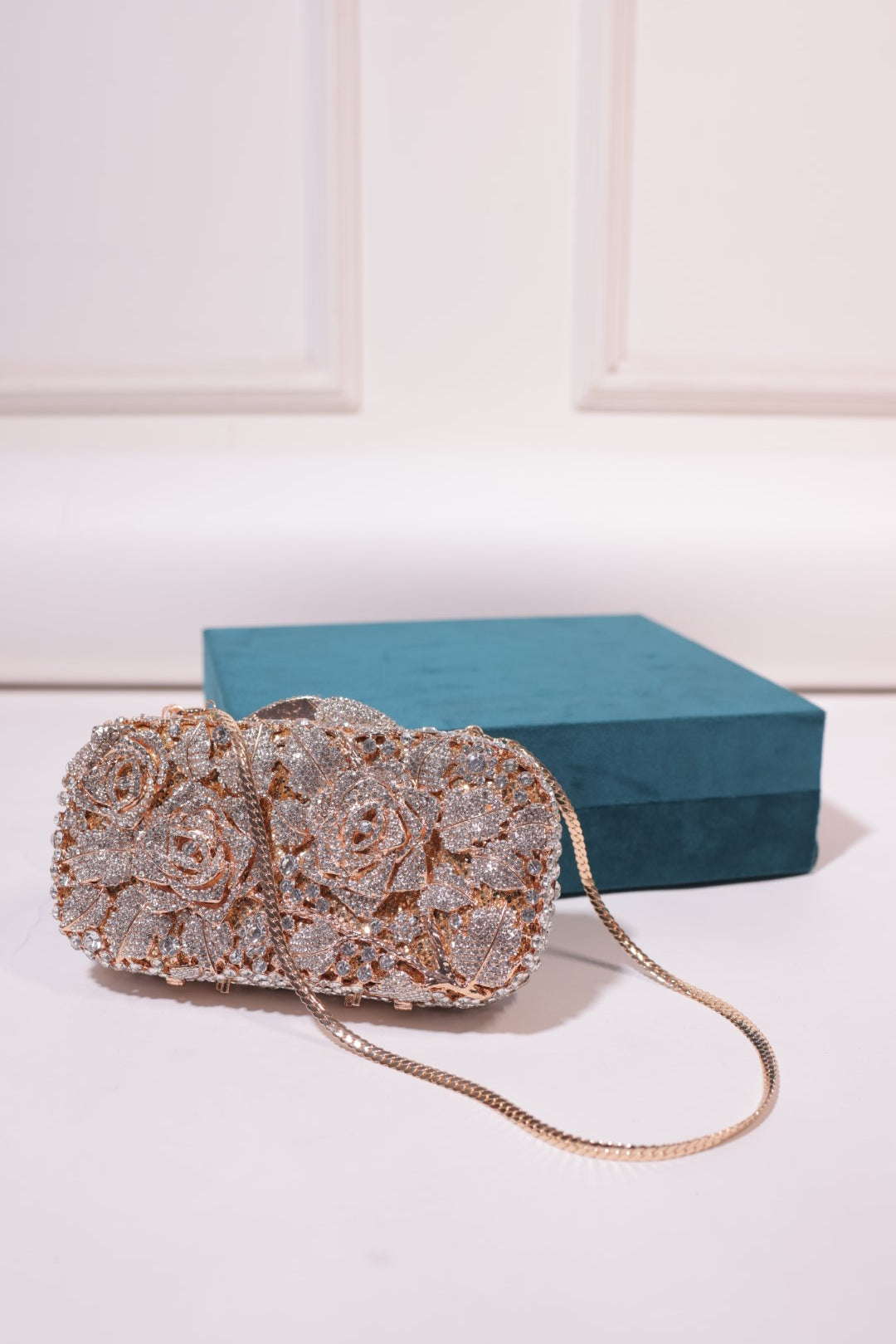 Crafted with a sturdy metal frame and a secure clasp, this clutch offers both durability and style. The detachable chain adds versatility, allowing it to be worn as a shoulder bag or carried as a clutch. The shimmering crystals and delicate floral design make this piece a perfect accessory for formal events, adding a touch of glamour to any Outfit.